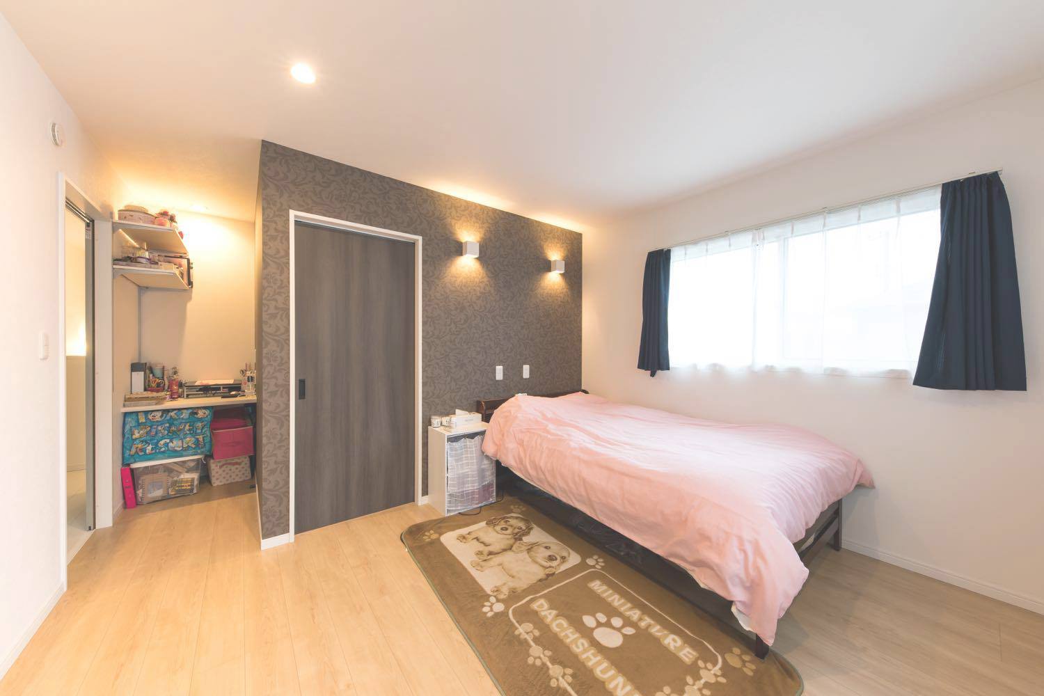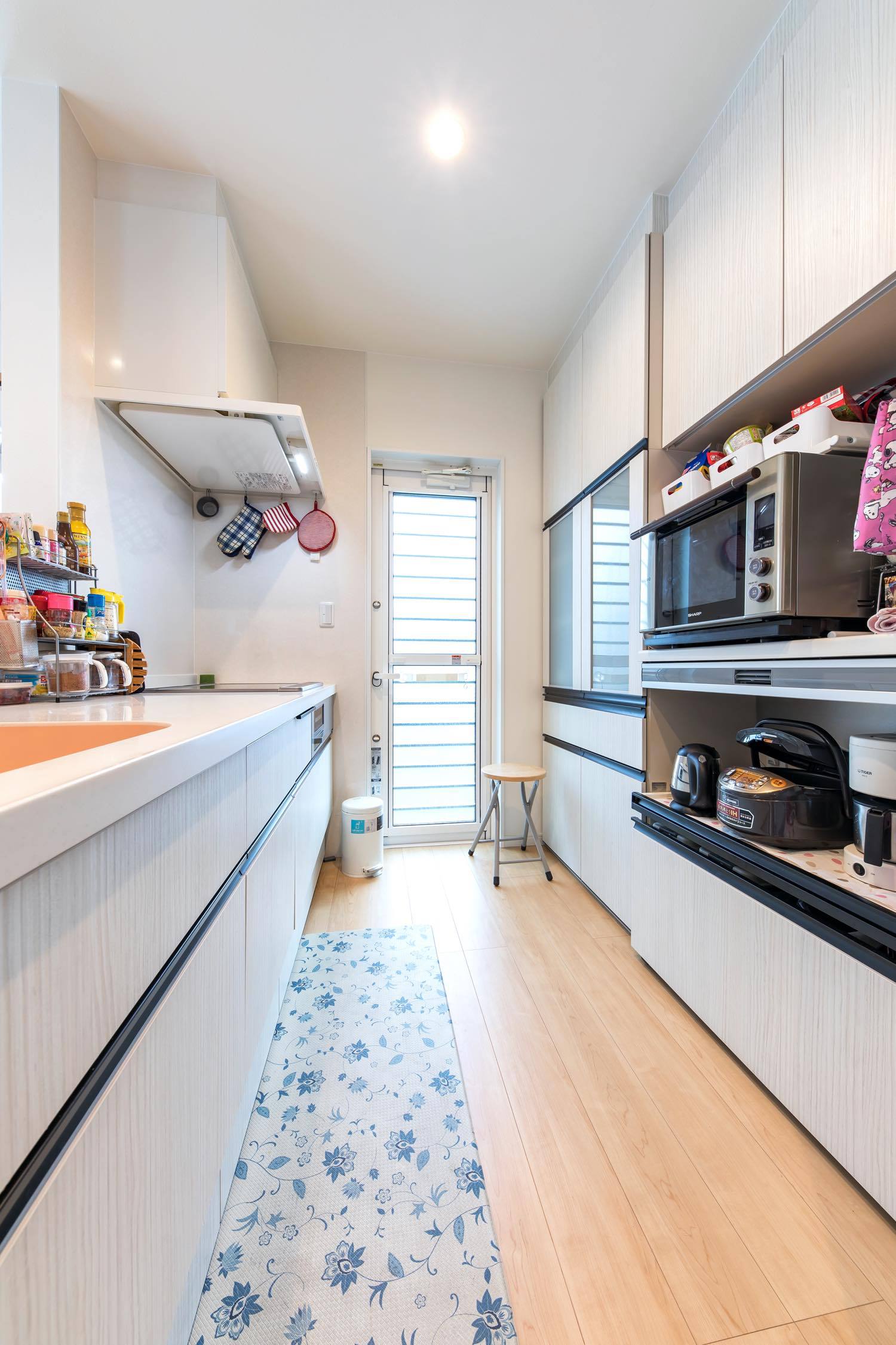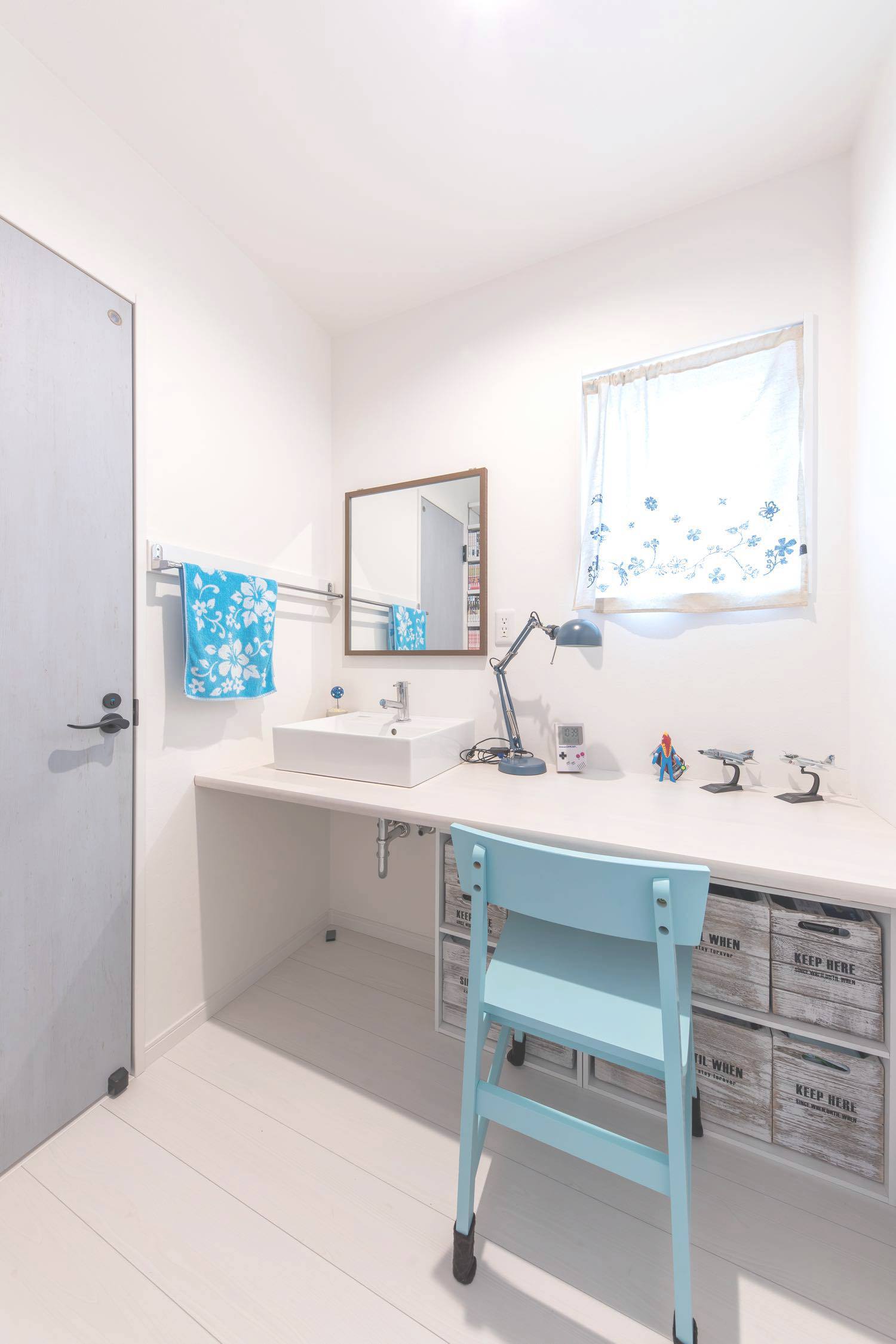 「職場に近くて馴染みがある清水で家を建てようと思っていたんです。他の住宅屋さん?回ってないですね(笑)。」 友人が外構業者で出入りしていたという縁で「いい営業の方がいると紹介され、東海ハウス完全一択。追分の展示場も等身大仕様で、はじめから親近感が沸きました」と話すKさんご夫妻。その選択にも完成した家にも大満足だという。 住宅展示場に行くと、性能面やオプション仕様をフルスペックで見せるモデルハウスが並び、そこで身に余る夢を描くこととなる。いざ家を!と計画を進めると、標準仕様では物足りず、予算をはるかにオーバーした加算住宅か、泣く泣くいろいろなものを諦める減算住宅になったという例はよく耳にする。 しかし東海ハウスは、ゼロエネや高気密高断熱は標準仕様で、さらに畳やタンクレストイレ、ムーブダウン収納やニッチの造作も施主の希望に沿って、等身大プラスアルファの家を実現してくれる。 オプションを進める加算型の家づくりは、かえって過剰スペックの肥満な家を生みかねないが、あまりに減算型では夢も味気も無いというもの。「何を減らされてるのかわらないくらいでした。暮らし方や使い方から逆算した提案をしてくれたので、これがあったらなぁという後悔も一切ありませんでした」と自身の家づくりを振り返った。 希望の立地では予算オーバーだったため、土地を一から探すことになったそうだが、分譲地が計画中の段階から「清水に通える距離、津波の来ない環境」を満たす物件を分譲地が計画中の段階に営業さんが見つけ出し、家づくりはスタート。ハタさんがすぐ近くに住む立地で家を構えることになった。 「営業技術のツルミさんのおかげで、家が完成した後も、本当こうしておけばよかったという事はまったくありませんでしたね。現場のキムキム(木村さん)は同い年ということもあり、こちらの趣味や意図を汲んで、素敵な提案をたくさんしてくれました。家づくりの途中でも、小上がりの前に階段をつけるという仕様変更に柔軟に対応をしてくれて…住んで1年半経ちますが、本当に満足しています。」 とのこと。「ここで何をするの?」という発想で細かな仕様を決めてゆき、暮らし方や使い方から家を作る東海ハウス。ふたりの描く等身大のイメージがつぎつぎと形になっていった。 小物から中のイメージを決めたという1階のトイレと、お互いの趣味のためのスペース。それぞれの部屋は壁紙が変えてあるにも関わらず、不思議と統一感がある。絶対に欲しかったという広い2階のベランダやピンクのシンク、淡いグリーンの玄関扉に薄いブルーの水回りのドア、趣味のものを飾るニッチやご主人希望の本棚にウォークインクローゼット。そして「金額が追加になってでも!」という2階のトイレの壁紙。お互いの希望を散りばめたインテリアを「ツルミさんだからまとめてくれた」と、設計に対しても満足の様子。取材中に腰掛けた小上がりの畳部屋は、ソファと同じ高さに設けられ外からも直接アプローチが可能。友人の子ども達にも大人気だ。ドアで区切ればそこは子どもだけの秘密基地にもなるが、大人が腰掛けるのにちょうどよいスキップフロアでもある。 取材中の二人のにこやかな表情と営業さんとの漫才のような掛け合いが、施主と施工者の信頼関係を物語っていた。 大好きなミニ四駆と食玩が並ぶ趣味の家で、ふたりは今日も笑顔で暮らしている。
