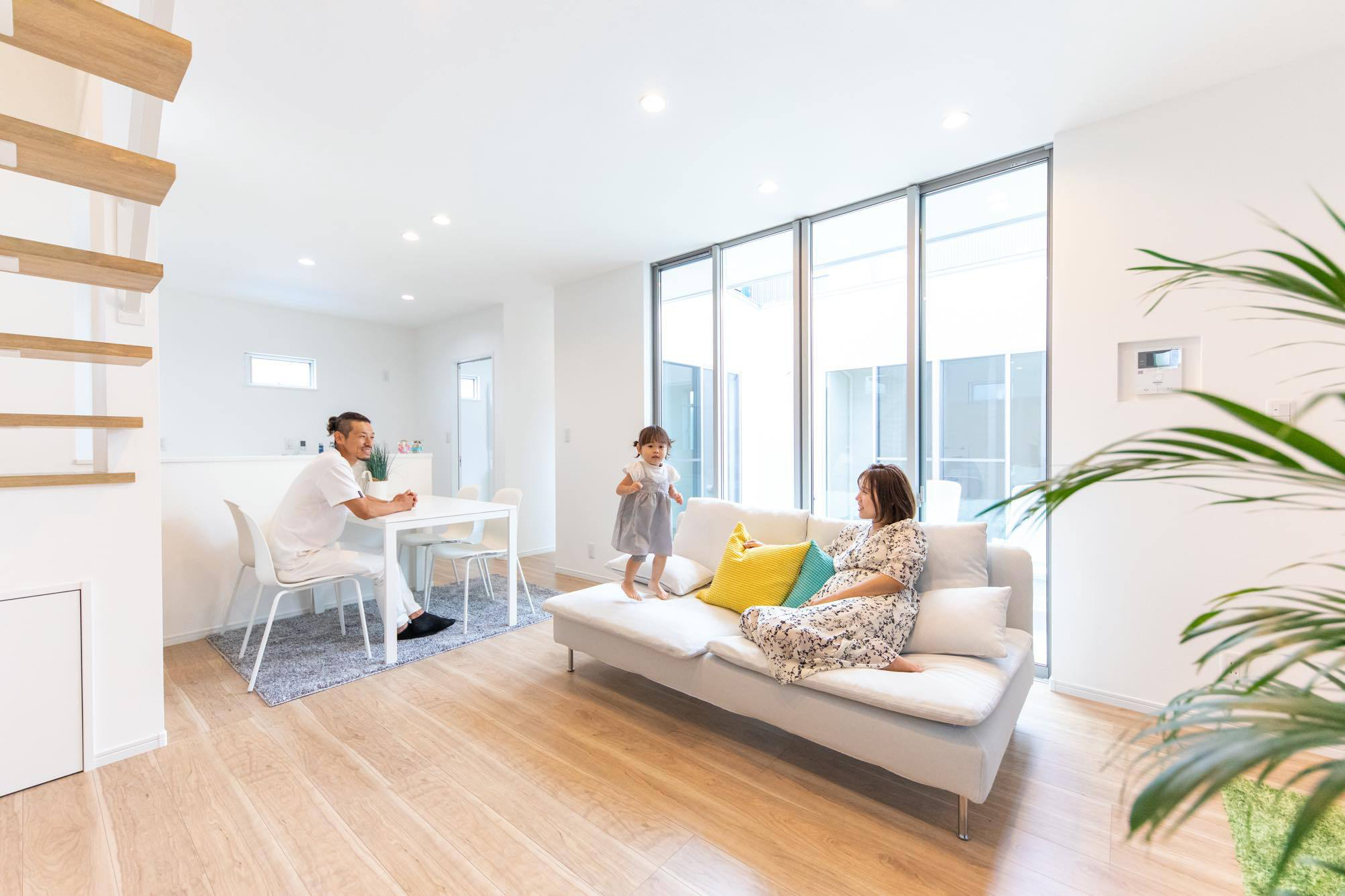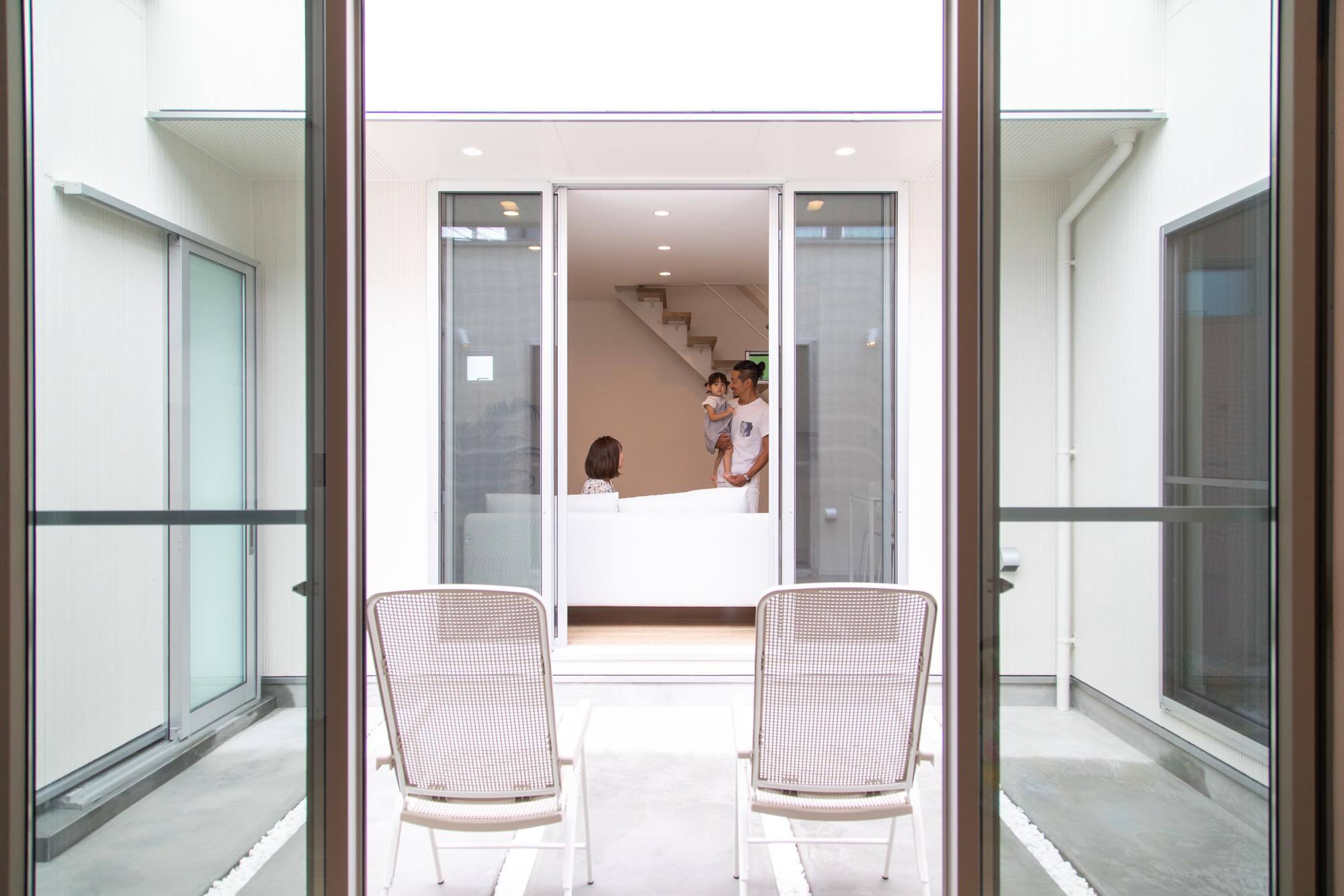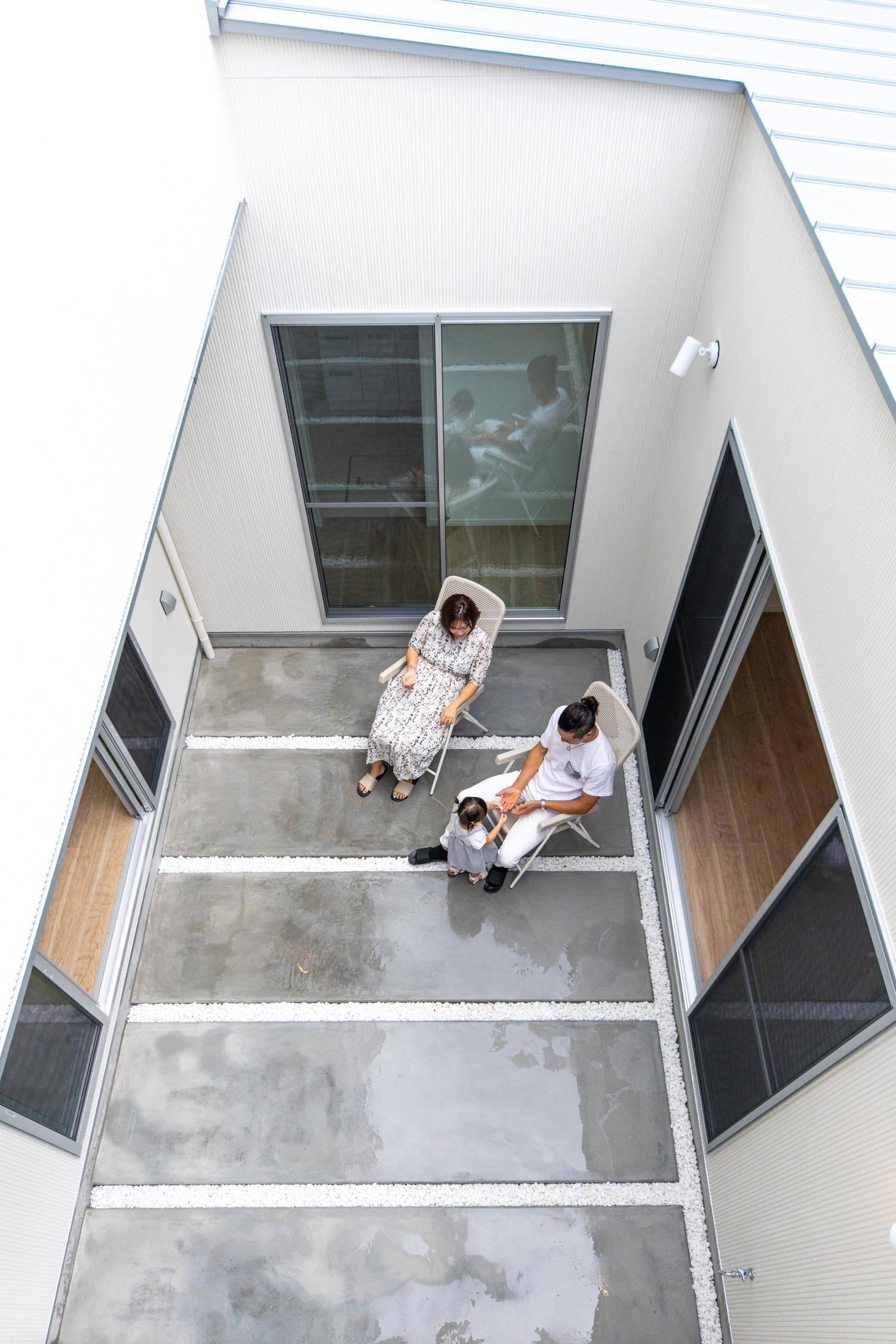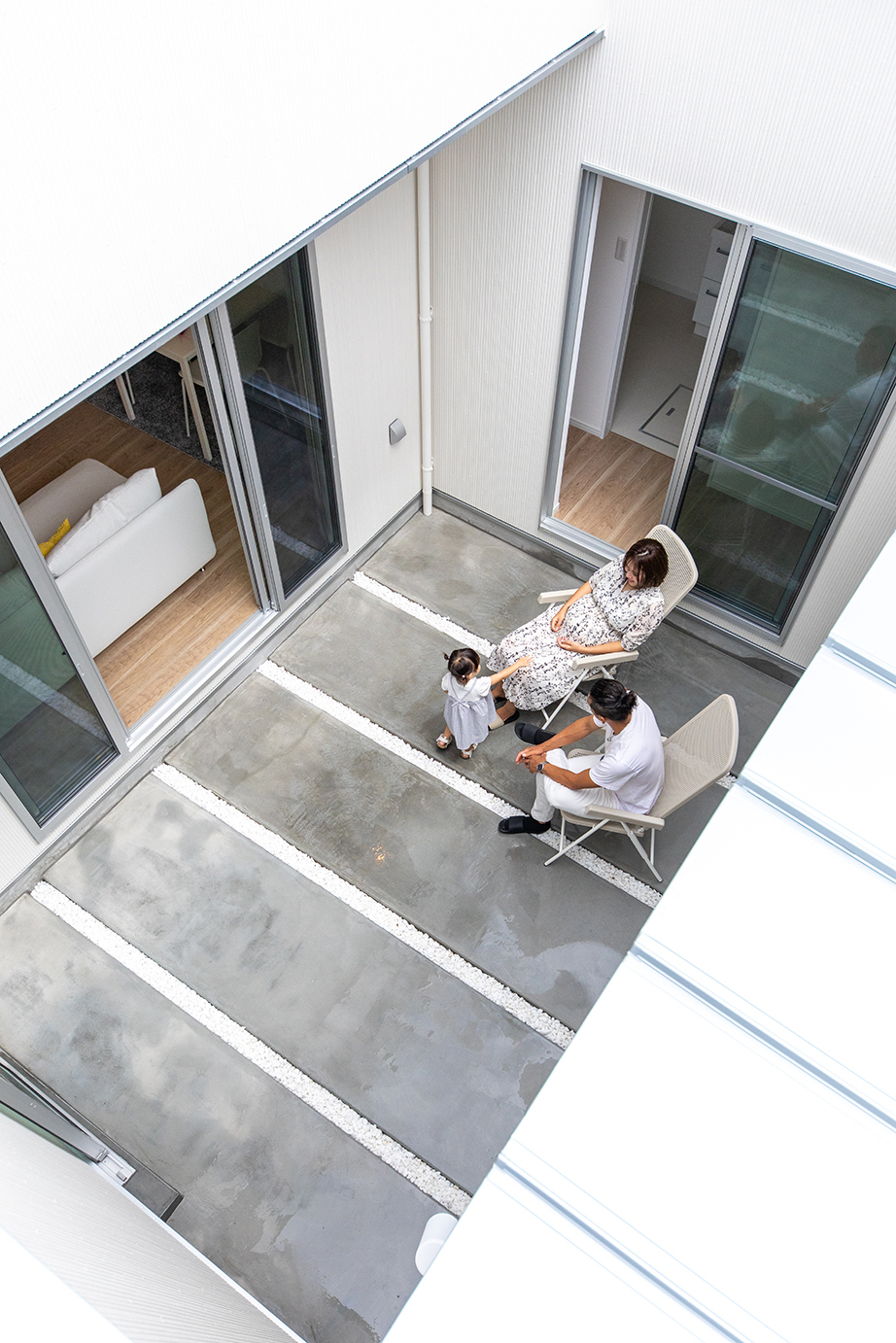 平屋 + α(子供部屋)の暮らし心地や、中庭=プライベートガーデンの魅力を感じることができる家。延床25坪のサイズながら、広さも楽しさも便利さも、まったく不足を感じさせないプランとなっていて、自分たちらしい住まい方ができる。玄関を入るとハイタイプ&半透明の建具で広さ、明るさを演出。シューズクロークは機能性も高く、明るく開放感のあるLDKにはスケルトン階段が特徴的。キッチンからは玄関や階段、中庭にも目が行き届くので、お子さんを目で追いながらの家事も可能。家事動線も配慮し奥様の移動範囲は最小限。住宅街にありながら、中庭のおかげで日射しを感じながらリラックスした時間を過ごすことができ、外からの視線も完全にブロックしつつ、室内に光と風、開放感を招く。 子どもの遊び場やBBQにも大活躍。中庭を通ればお風呂へも直行!外から見られない、光たっぷりの人と自然と住まいが寄り添う中庭のある贅沢な暮らし。