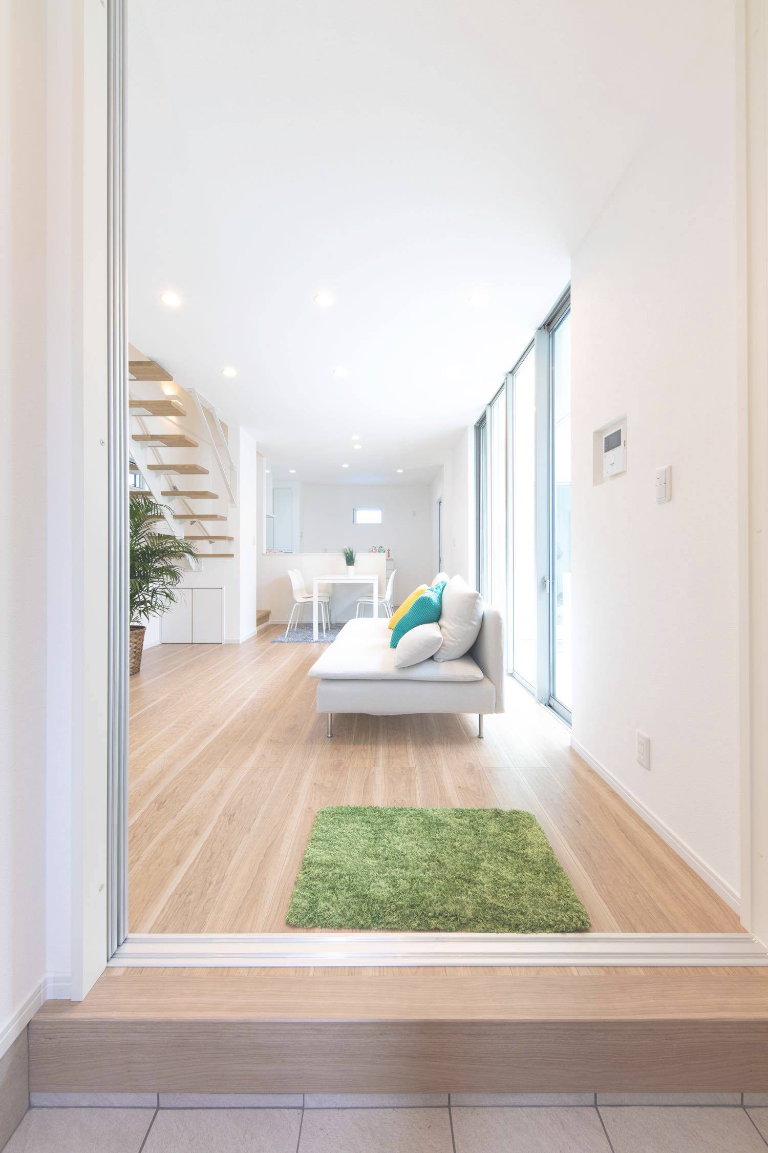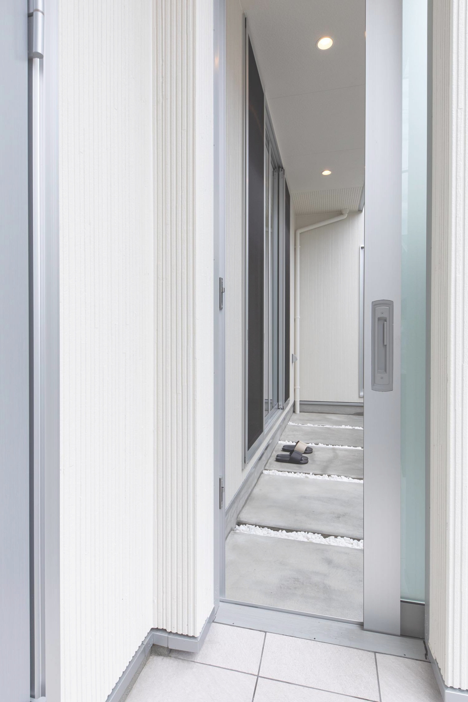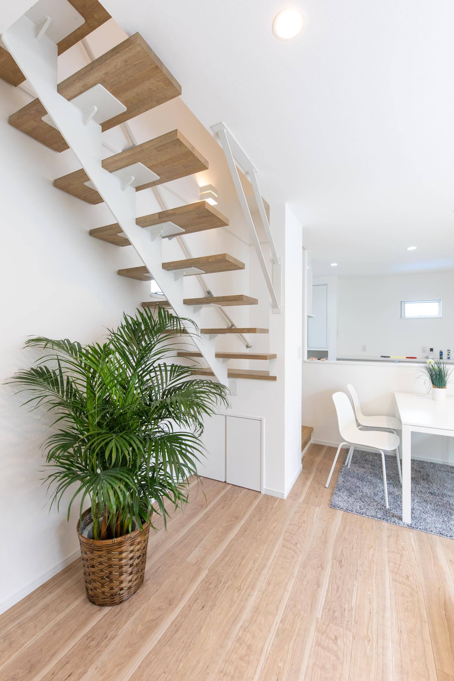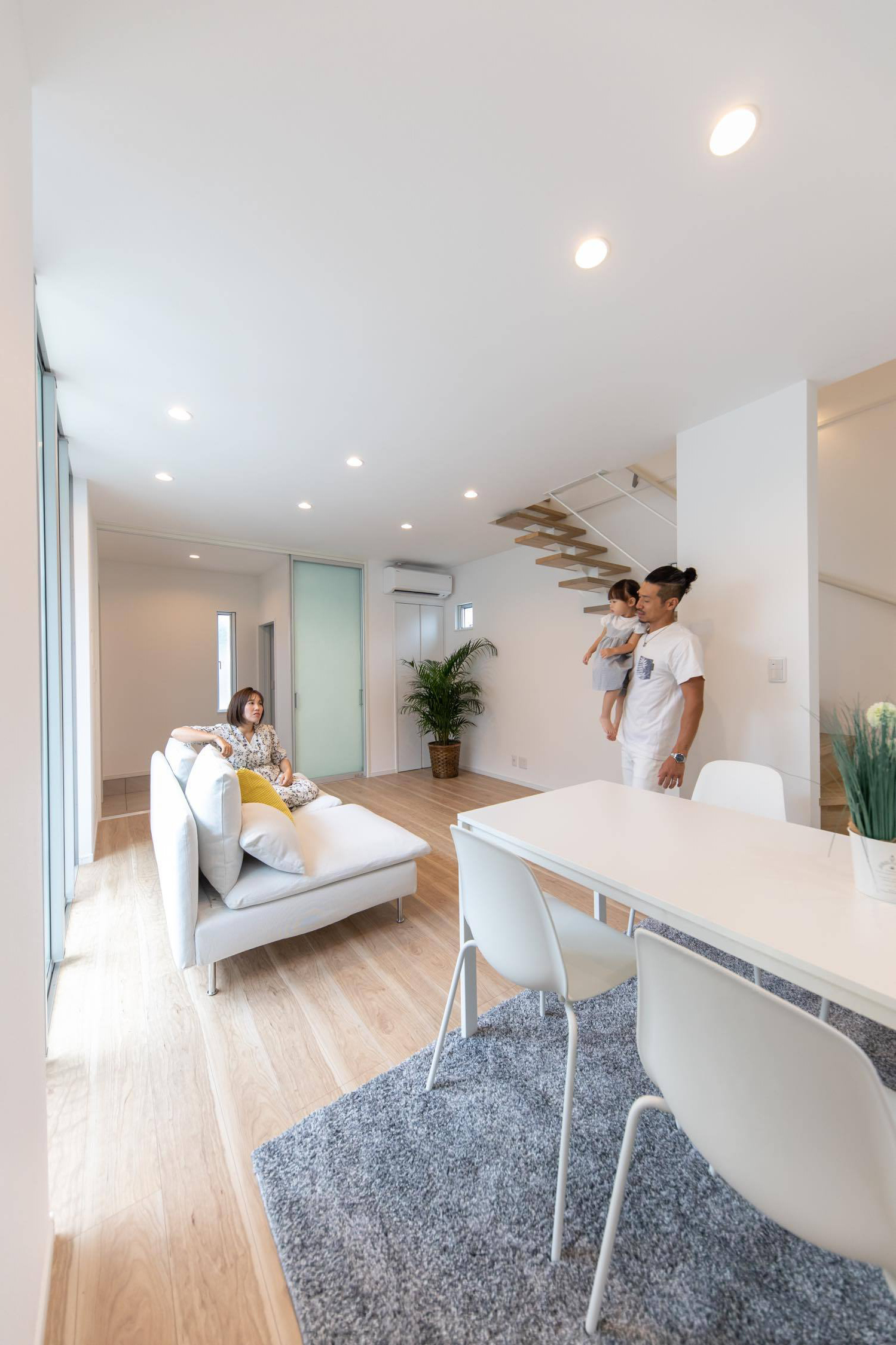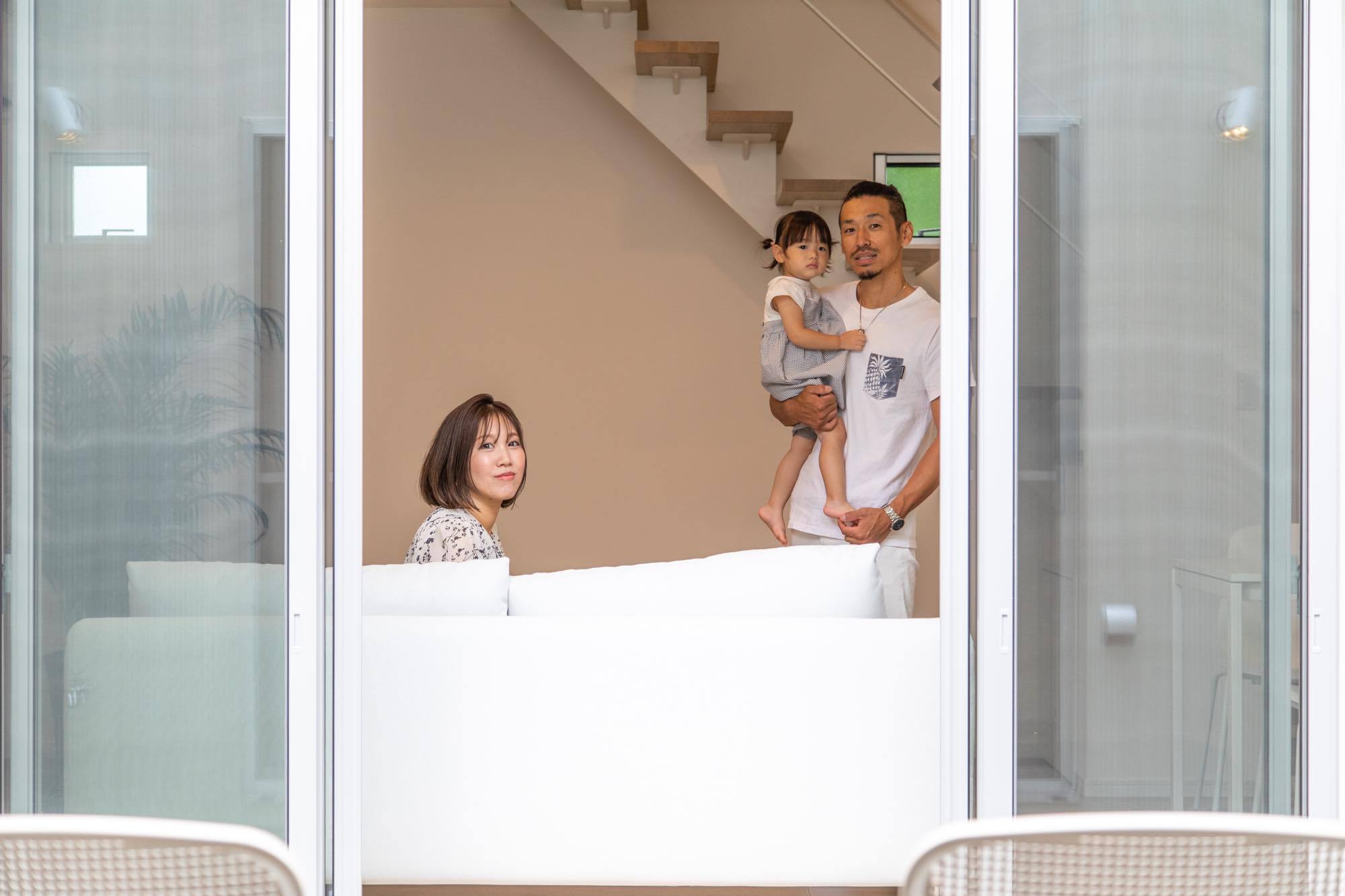 平屋 + α(子供部屋)の暮らし心地や、中庭=プライベートガーデンの魅力を感じることができる家。延床25坪のサイズながら、広さも楽しさも便利さも、まったく不足を感じさせないプランとなっていて、自分たちらしい住まい方ができる。玄関を入るとハイタイプ&半透明の建具で広さ、明るさを演出。シューズクロークは機能性も高く、明るく開放感のあるLDKにはスケルトン階段が特徴的。キッチンからは玄関や階段、中庭にも目が行き届くので、お子さんを目で追いながらの家事も可能。家事動線も配慮し奥様の移動範囲は最小限。住宅街にありながら、中庭のおかげで日射しを感じながらリラックスした時間を過ごすことができ、外からの視線も完全にブロックしつつ、室内に光と風、開放感を招く。 子どもの遊び場やBBQにも大活躍。中庭を通ればお風呂へも直行!外から見られない、光たっぷりの人と自然と住まいが寄り添う中庭のある贅沢な暮らし。