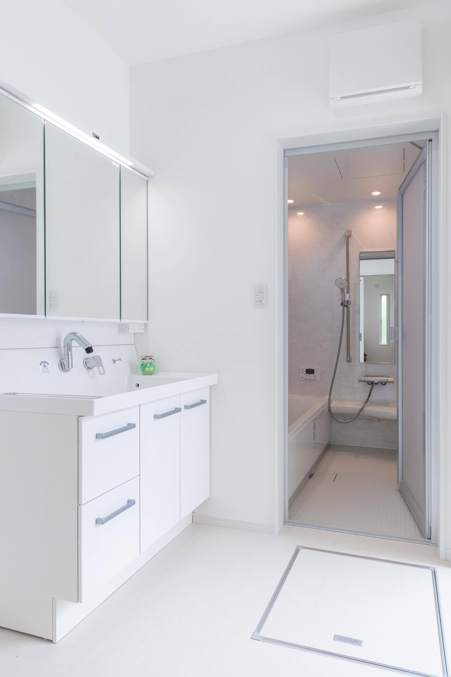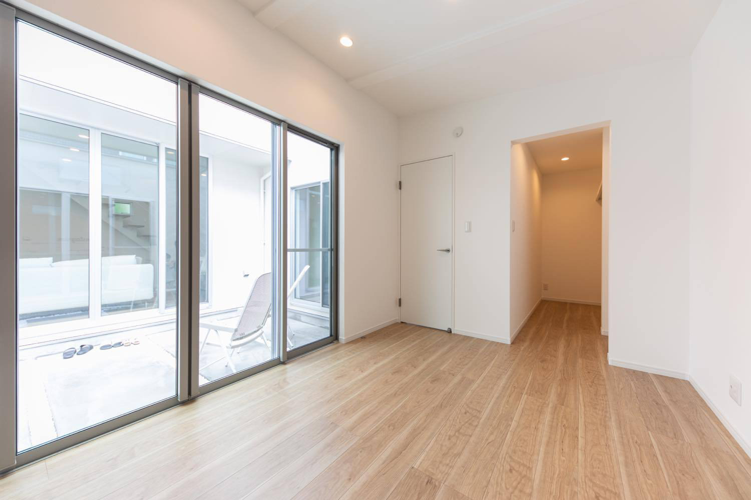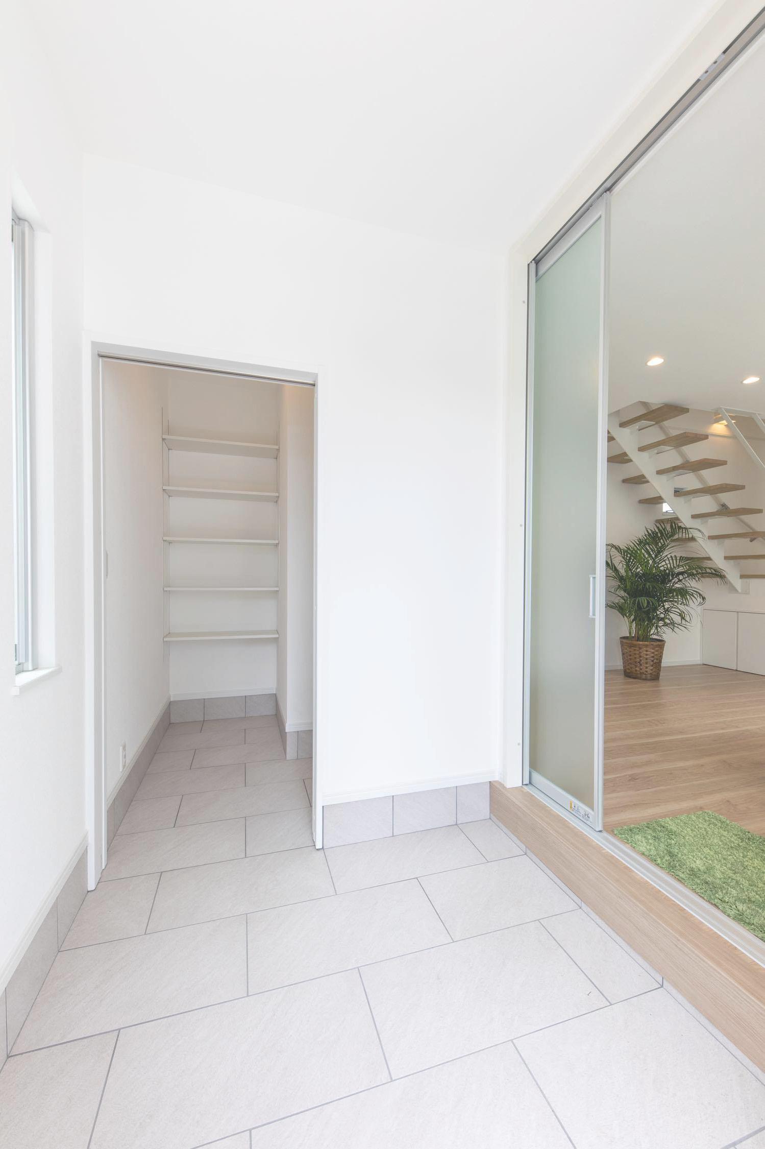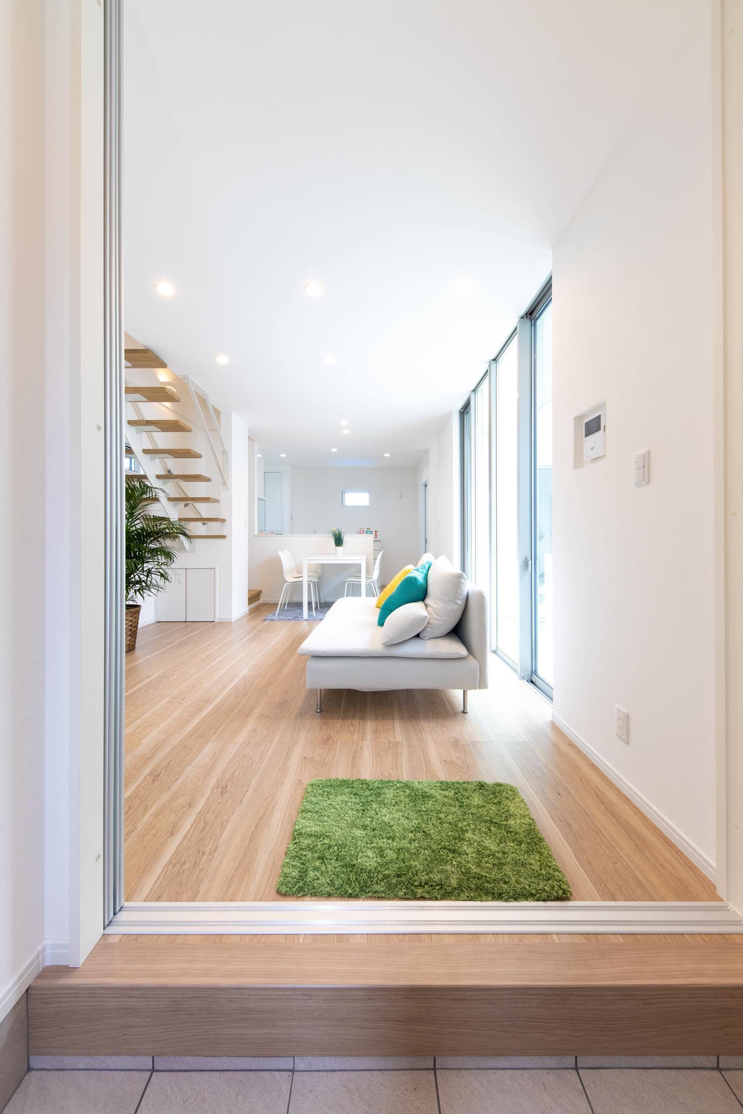 平屋 + α(子供部屋)の暮らし心地や、中庭=プライベートガーデンの魅力を感じることができる家。延床25坪のサイズながら、広さも楽しさも便利さも、まったく不足を感じさせないプランとなっていて、自分たちらしい住まい方ができる。玄関を入るとハイタイプ&半透明の建具で広さ、明るさを演出。シューズクロークは機能性も高く、明るく開放感のあるLDKにはスケルトン階段が特徴的。キッチンからは玄関や階段、中庭にも目が行き届くので、お子さんを目で追いながらの家事も可能。家事動線も配慮し奥様の移動範囲は最小限。住宅街にありながら、中庭のおかげで日射しを感じながらリラックスした時間を過ごすことができ、外からの視線も完全にブロックしつつ、室内に光と風、開放感を招く。 子どもの遊び場やBBQにも大活躍。中庭を通ればお風呂へも直行!外から見られない、光たっぷりの人と自然と住まいが寄り添う中庭のある贅沢な暮らし。