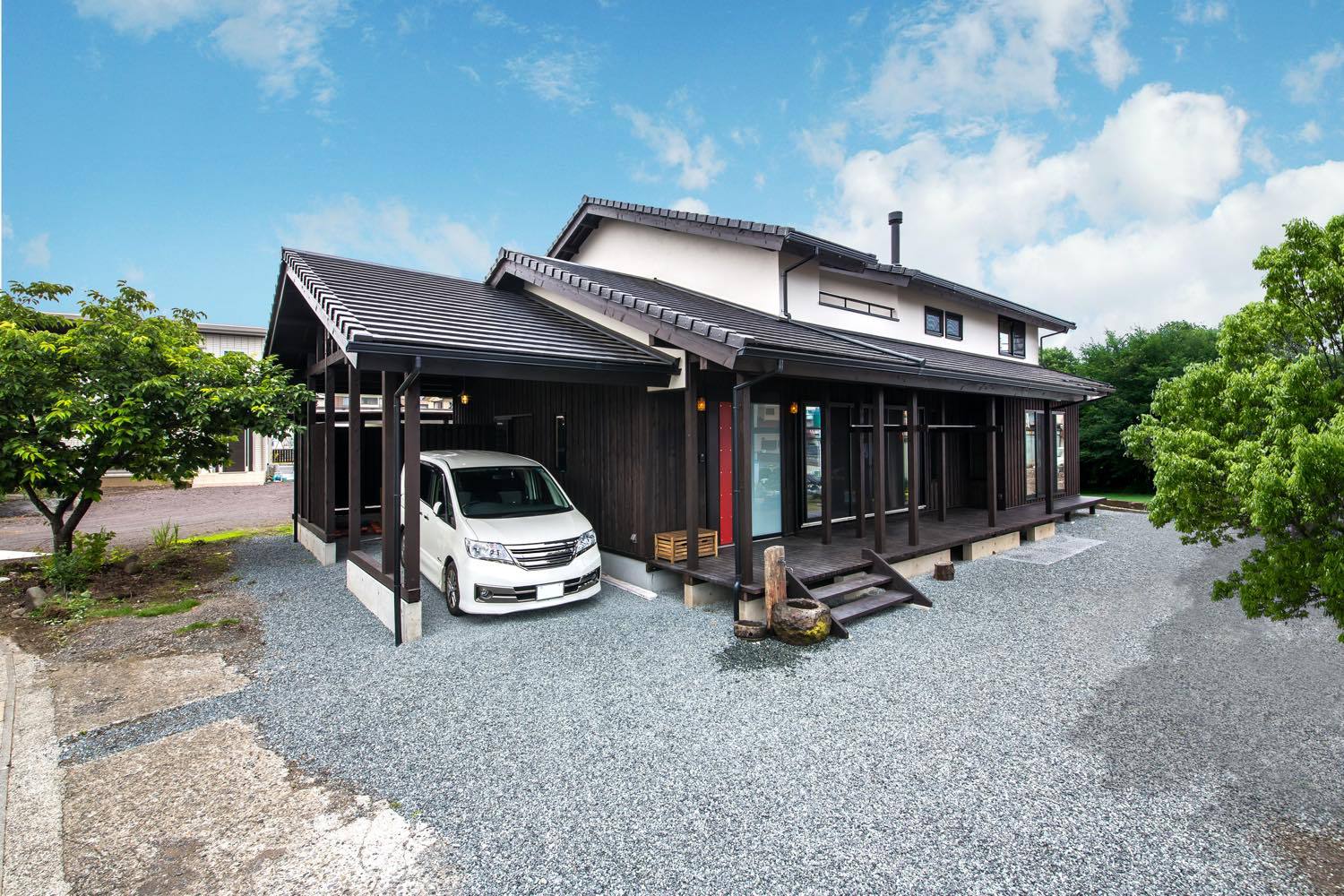 住む人が安心して健やかに生活できるよう快適性・安全性・耐久性はもちろん!こども達がのびのび成長できる家を実現させた自然素材をふんだんに使用した“和の家”。 在来木造ならではの大きな梁・柱を使い、木の香りで包んでくれる。玄関ドアを開けると広大な土間ホールがひろがりデッキ側の土間には薪ストーブを設置してある。冬にはLDKはもちろん、吹抜けより暖気を2Fに運び、家全体をやさしく芯から温めてくれる。また、プランの中には遊びゴコロもふんだんに詰め込まれていて、2Fよりスルっと降りる事ができるポールや、天井に張り巡らせたロープネット・梁から垂れ下げられたロープ・ハンモック、壁面にはクライミングできるようホールドも!…子ども達にとってはアスレチックのような空間になっている。 各階・各用途に応じ収納空間もしっかり確保し、キッチンの背面収納も収納量だけでなく光の取り込みの工夫もされている。どこまでも開放的で光と時間…季節の移り変わりを感じられる住まいだ。